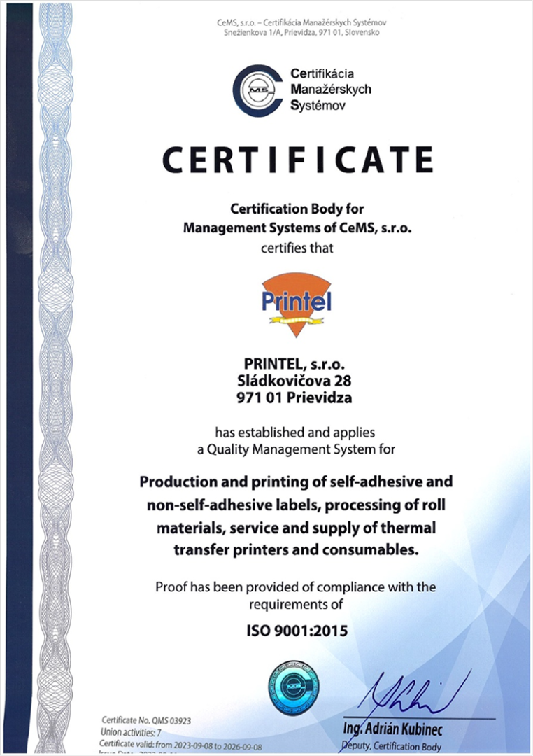 Unser Unternehmen PRINTEL, s.r.o. richtet sich langfristig nach strengen Qualitätsstandards. Die Qualität unserer Produkte und Dienstleistungen ist die Basis für das Vertrauen unserer Partner und für unseren Erfolg am Markt.